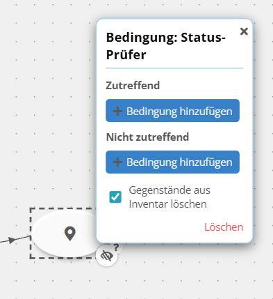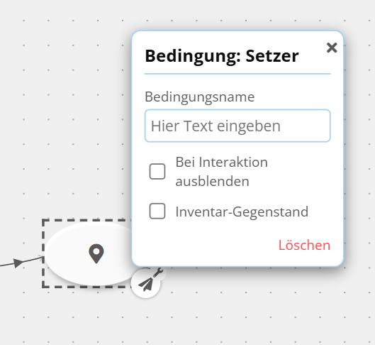 Modul: Bedingung (Setzer) setzt eine Bedingung auf „wahr“ (z.B. Schlüssel aufgehoben oder Objekt betrachtet) und kann optional als Gegenstand im Inventar angezeigt werden.
